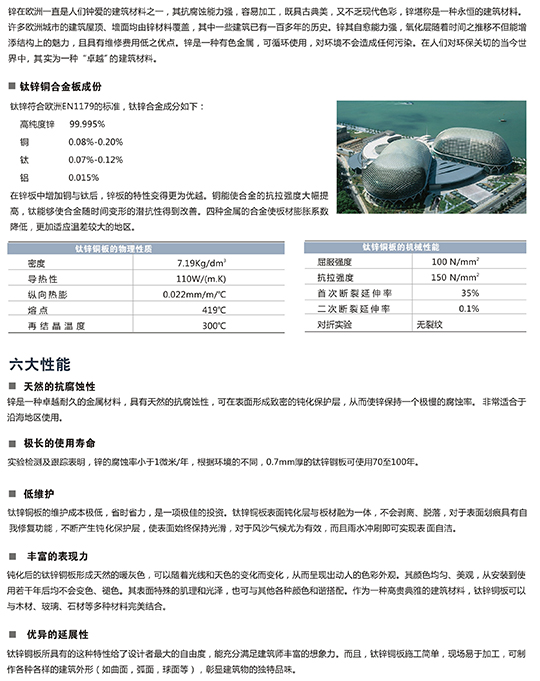 鋁單板幕墻板- 主要采用歐洲型號為AA5754H44鋁鎂合金、陽極氧化鋁、鈦鋅銅板、鍍膜鋼板等,厚度2.0、2.5mm或3mm的鋁合金板,金屬外墻用單層鋁板表面與鋁復合板正面涂膜材料一致,膜層堅韌性、穩(wěn)定性,附著力和耐久性完全一致。單層鋁板是繼鋁復合板之后的又一種鋁單板幕墻常用面板材料,而且應用的越來越多。