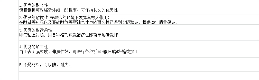 新日本制鐵公司的優(yōu)質(zhì)鍍鋅鋼板和杜邦公司的PVF氟化樹脂薄膜經(jīng)強(qiáng)化粘合加工制成的鍍膜鋼板具有PVF薄膜的高耐候性、抗腐性、耐藥性、耐磨損特性。是各建筑外墻、屋頂?shù)牧己貌牧?。更運(yùn)用于污染性高的地鐵、電廠、高速公路等領(lǐng)域。結(jié)合優(yōu)異的設(shè)計(jì)和加工能力,賦于PHEONEX普基產(chǎn)品更加靈活多變,外形獨(dú)特的優(yōu)勢,為世界高端的建筑幕墻設(shè)計(jì)筑造注入一份新的活力。